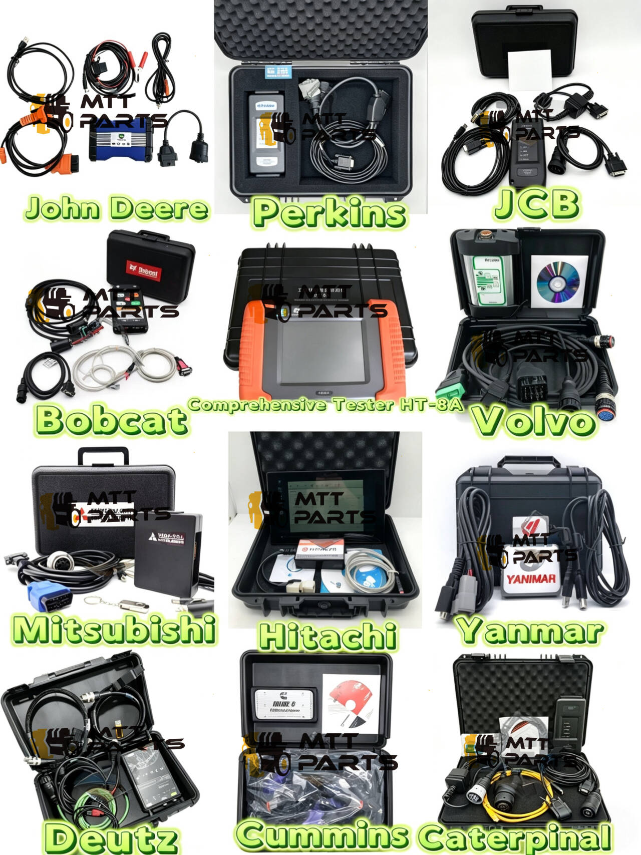 Vynikajúce je, ako prakticky vyzerajú. Žiadne všeobecné nástroje, ktoré by mohli fungovať napoly; toto sú nastavenia špecifické pre značku, ktoré sa správne pripájajú a poskytujú vám údaje, ktoré skutočne potrebujete. V strede je dokonca aj komplexný tester typu všetko v jednom (HT-8A) a možnosti pre značky, pre ktoré je o niečo ťažšie nájsť dobrú diagnostiku, ako sú Yanmar alebo Bobcat.